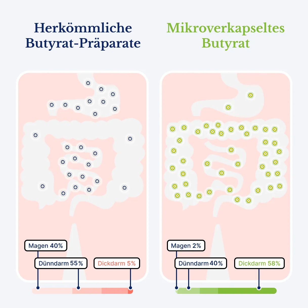 So gelangen 58 Prozent des Butyrats in den Dickdarm – 11-mal mehr als bei herkömmlichen Präparaten.