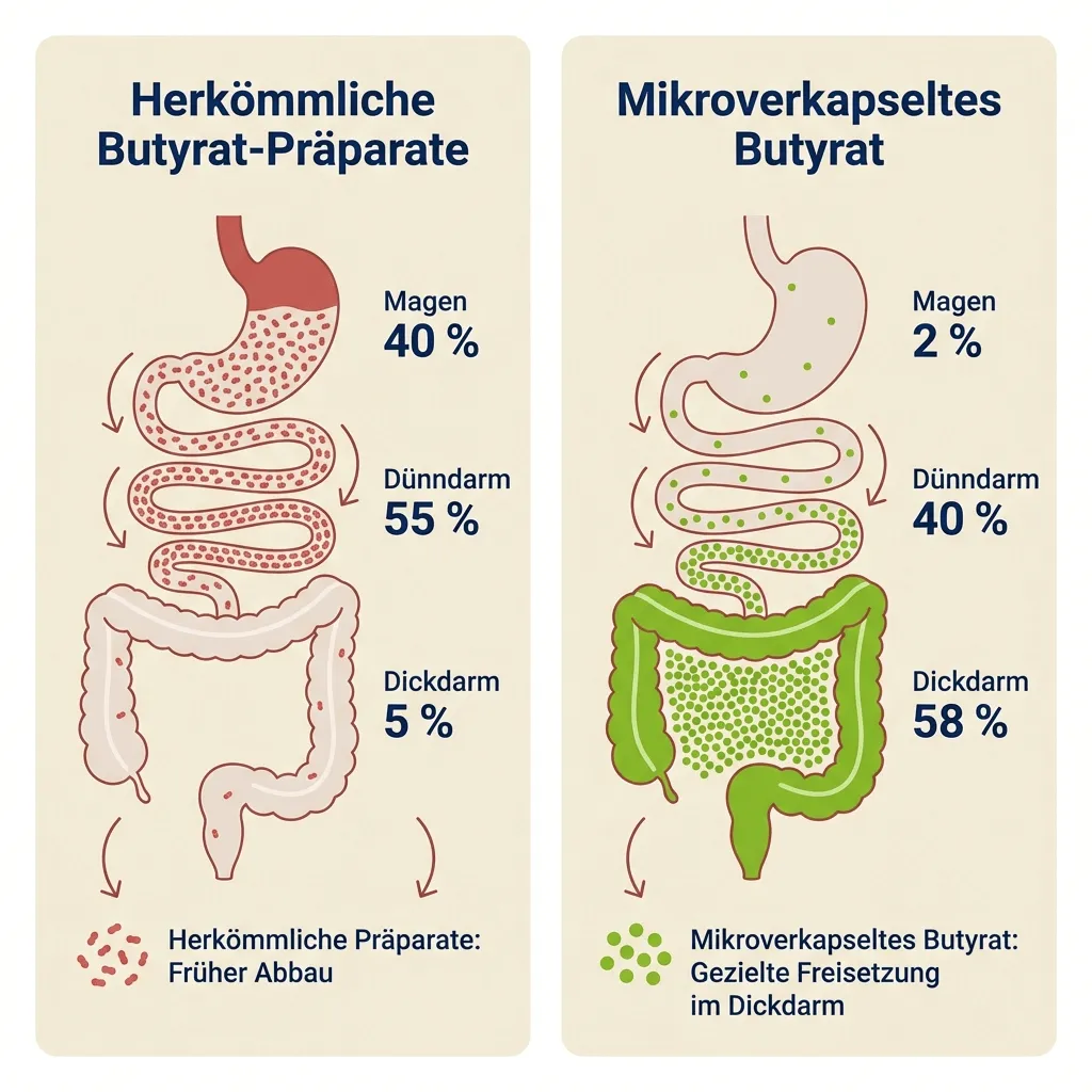 Dabei wird das Butyrat in eine schützende Lipid-Hülle eingeschlossen und im Dickdarm gezielt freigesetzt.