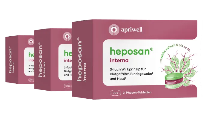 Das hat sich geändert. Seit Januar 2026 gibt es Heposan interna endlich auch in Deutschland. Heposan interna ist eine 3-Phasen-Tablette für Gefäße, Bindegewebe und Haut. Sie nehmen morgens eine Tablette mit etwas Wasser – das war's.